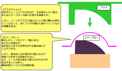 本格的な真空引きを行う前に、樹脂シートをあらかじめ引き延ばしておく「予備成形」が非常に重要です。代表的な手法として、軟化したシートに下から空気を吹き付けてドーム状に膨らませる「予張ブロー」や、プラグと呼ばれる補助型でシートを押し込む「プラグアシスト」などがあります。これにより、シート全体の伸びが均一化され、ショックラインの発生を防ぎます。