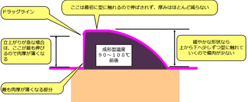 成形中、加熱され軟化した樹脂シートは、まず金型に接触した部分から冷却が始まります。冷却された部分は硬化し、伸びにくくなる性質があります。一方で、まだ金型に接触していない、あるいは接触が遅れた部分は高温状態を保ち、よく伸びる状態にあります。