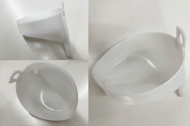 材質はPC(ポリカボネート)、板厚5mmの製品となります。寸法は約1800×400×250mm、R部は50Rとなります。上部に長い切欠きがあるので部分加熱では歪んで形になりません。そのため、全面加熱でR曲げ加工をしています。コの字の場合はR間の直線部分の熱収縮を予測した加工をするので経験とデータが必要です。養生シートを貼ってあるのでわかりにくいですが、 歪みがない綺麗な表面になっています。